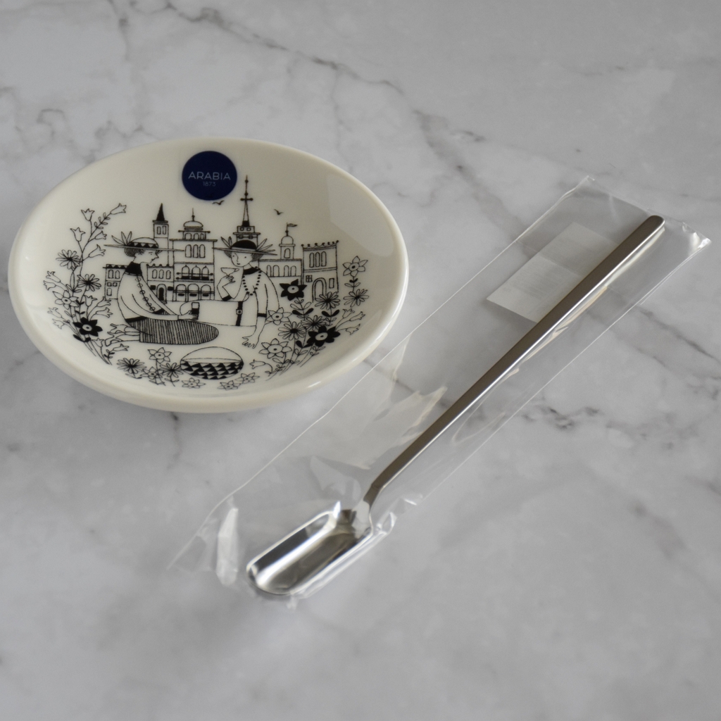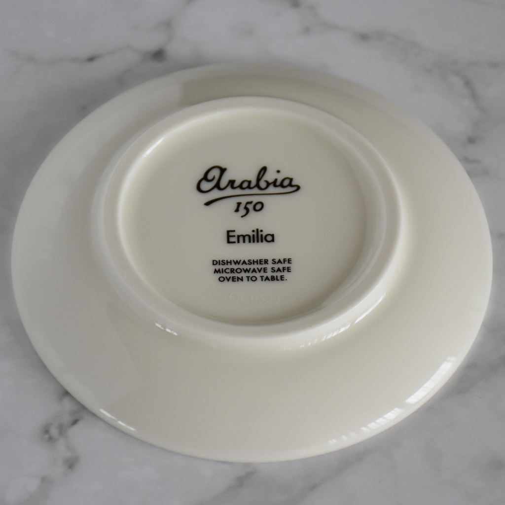 エミリアの表面には【ARABIA】ロゴシール、裏面には商品ラベル。