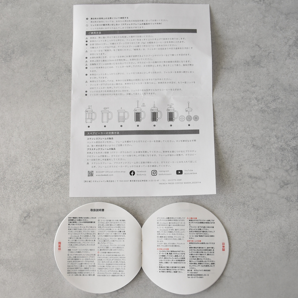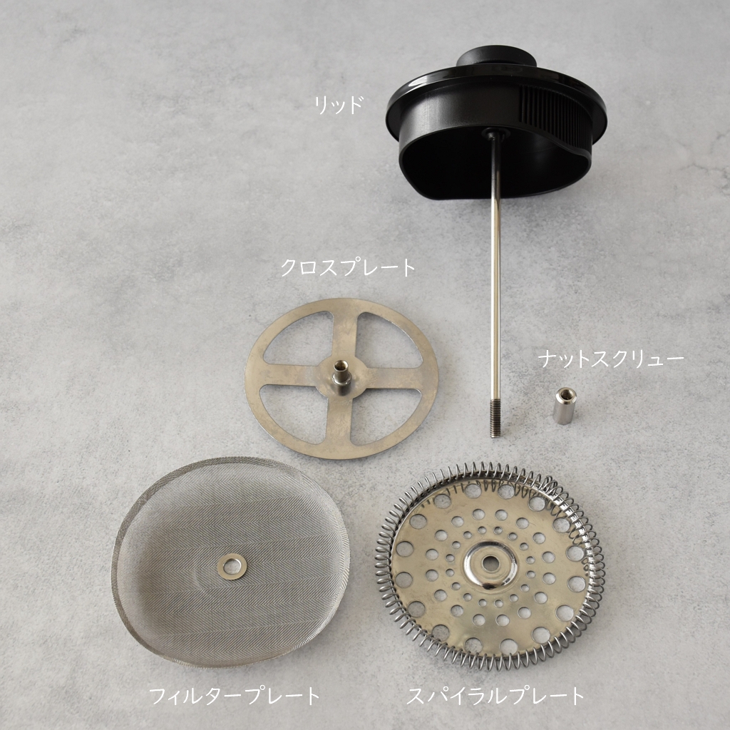 セット内容は、ポット(ガラスビーカー、フレーム)、プランジャーリッド、メジャースプーン(約7g)、取扱説明書。