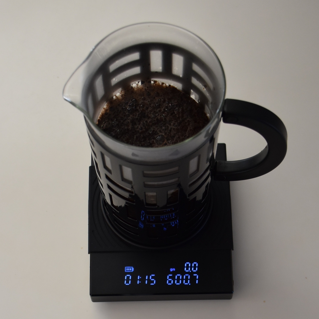 プランジャーを引き上げたまま、リッドをのせて蒸らす。(蒸らし時間4分)