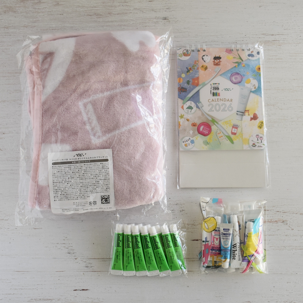 ジェルコートFと様々なオーラルケアのサンプル品、カレンダー、そして、ブランケットが入ってました。
