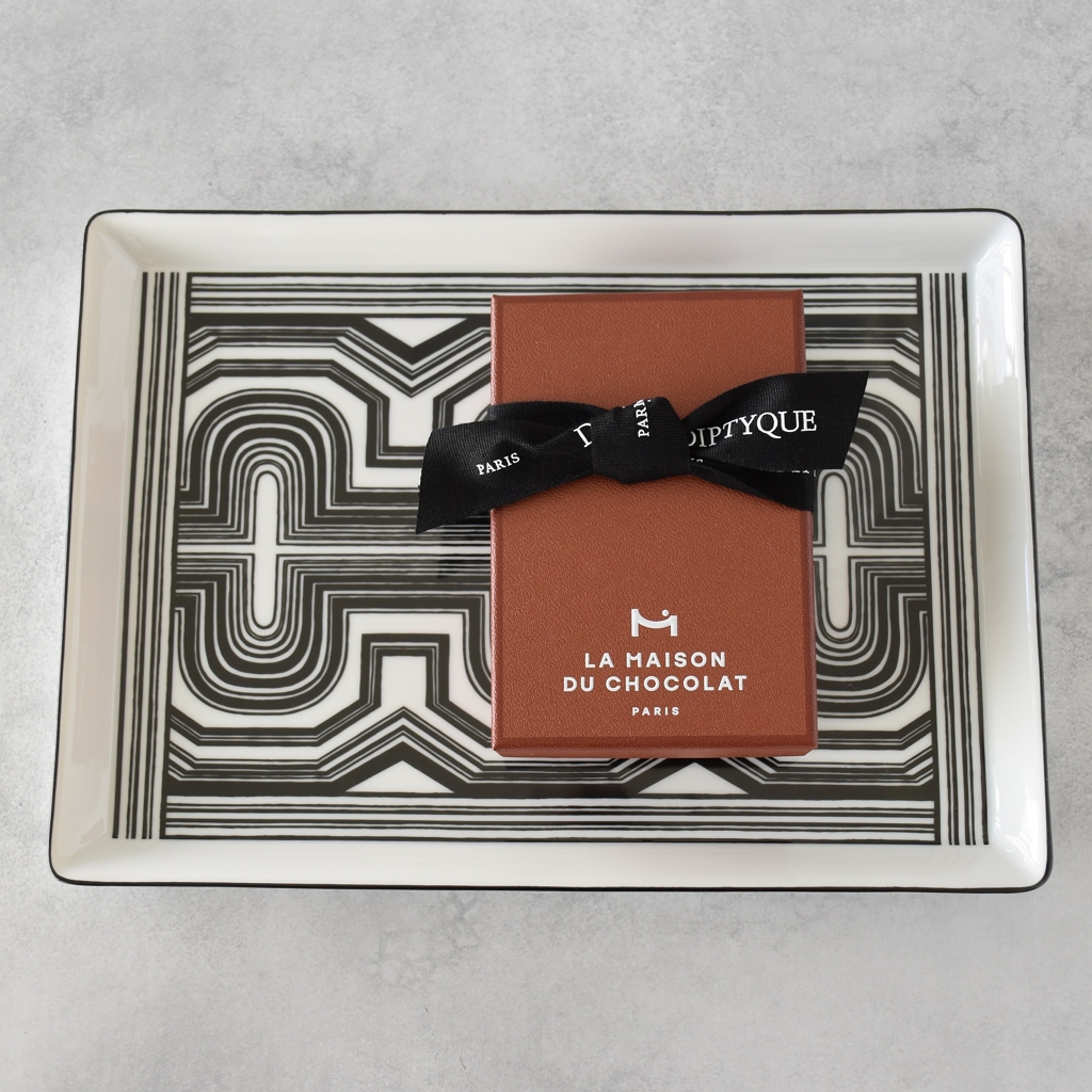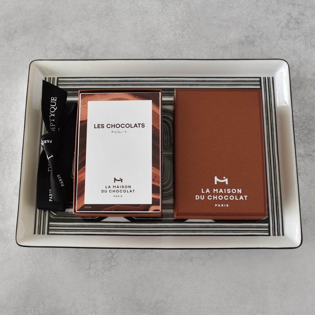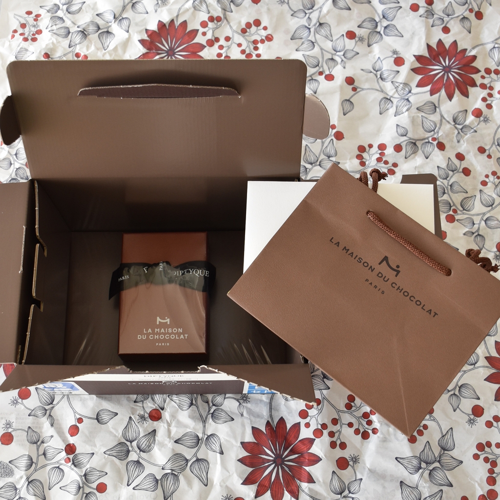 ディプティックのリボンが架けられた【ラ・メゾン・デュ・ショコラ】の小さな箱。