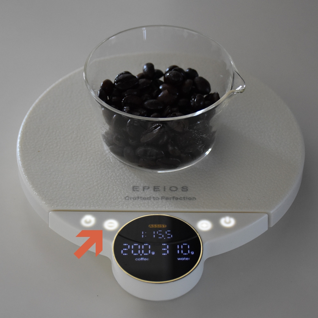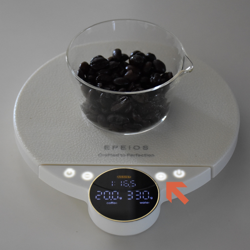 【ASSIST】が【1:16】なら、コーヒー10gに対してお湯160mLを注ぐ場合の湯量を表示。