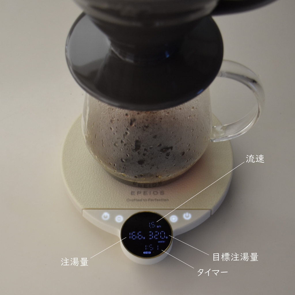 コーヒー器具を下すと、タイマーがストップし、流速が0になります。