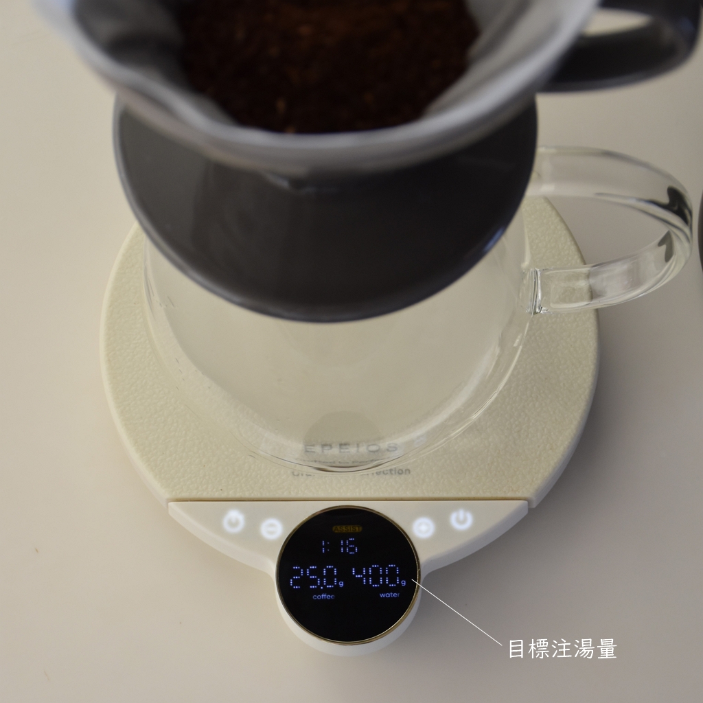 コーヒー粉を入れると、目標注湯量が自動計算。