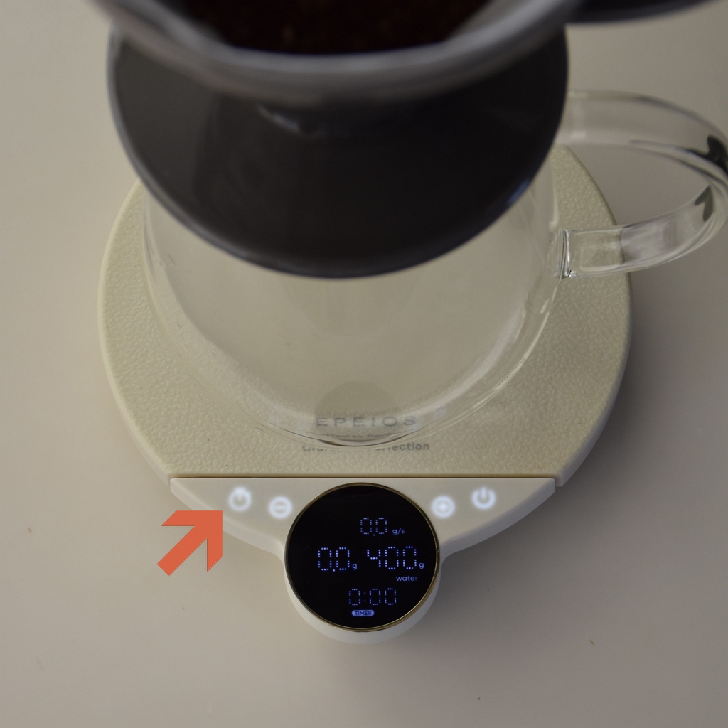 コーヒー器具をのせ、電源ボタン(0リセットボタン)を押す(テア)。