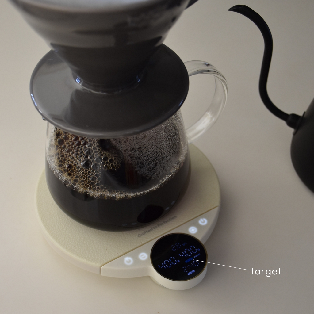 注いだ湯量が目標注湯量の10g手前になると「ピッ」と音が鳴り、目標注湯量に達すると「ピッピッ」と2回音が鳴り、【target】インジケーターが点灯。