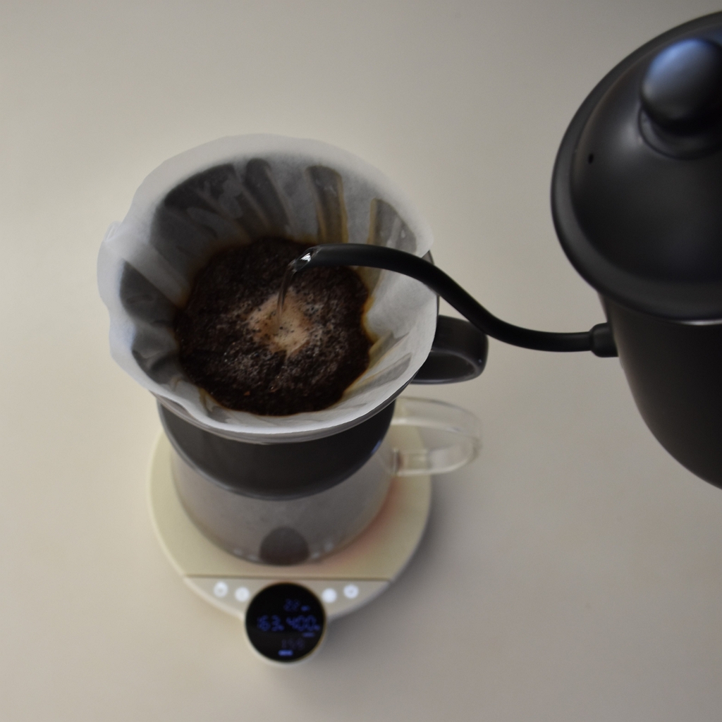 コーヒー豆の焙煎具合や豆の量に応じて、流速と抽出時間に注意しながら、目標注湯量を目安に、お湯を注ぐ。