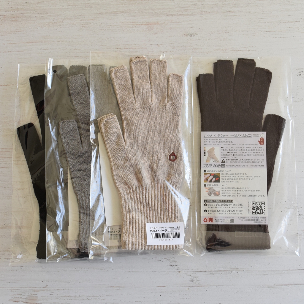 手首も指も短い【内絹外綿ハンドウォーマー】から始まり、翌年には指先が長い【シルクハンドウォーマーMAX】に。