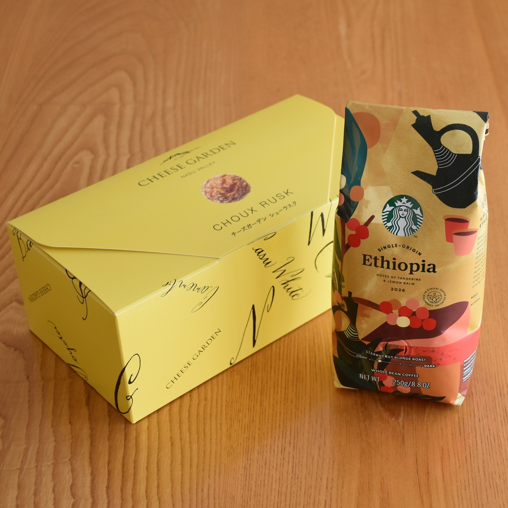 チーズガーデンの福袋に入っていた【シューラスク(こんがりシュガーシュー)】と、スターバックスのシーズナルコーヒー【シングルオリジン エチオピア 2026】。