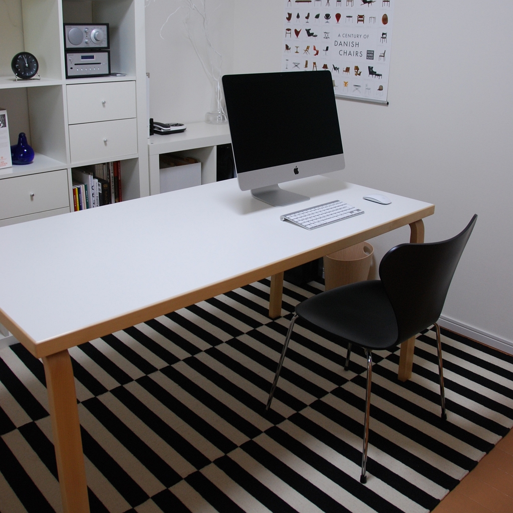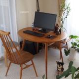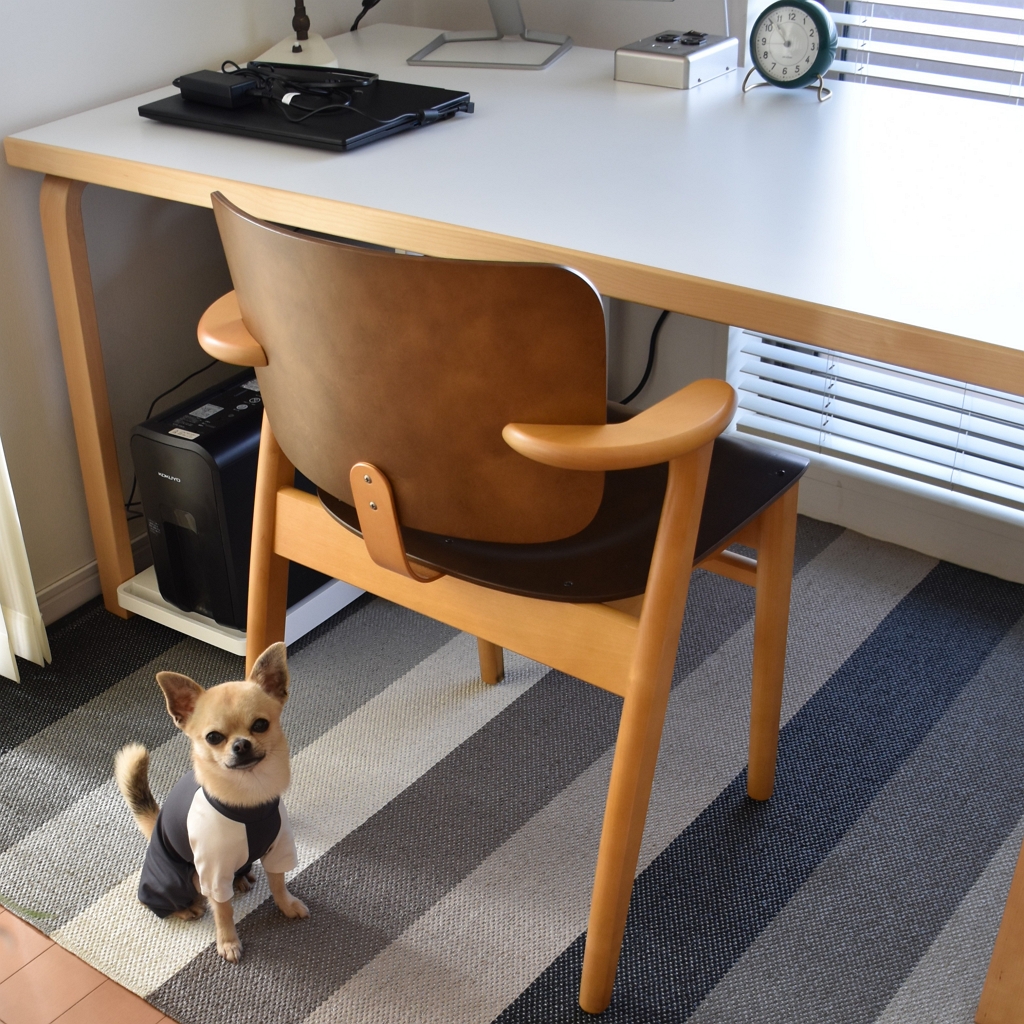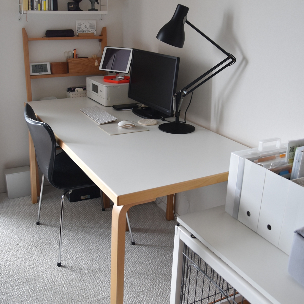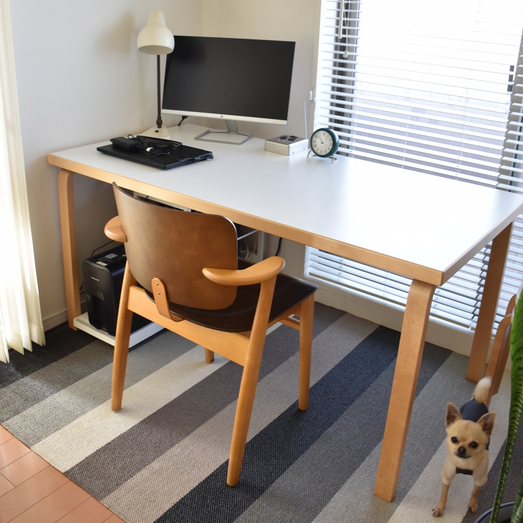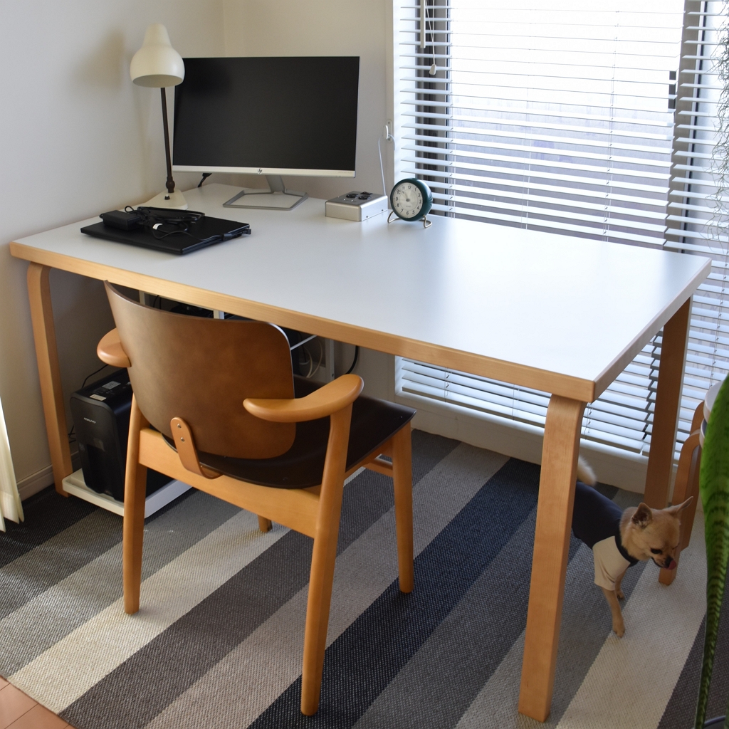 ワークスペースにアルテックの長方形テーブル(Artek Table 81A)とドムスチェア(Artek Domus Chair ウォールナット×ハニー)を置きました。デスクトップパソコンの移動でワークスペースも変わり、iMacは処分。処分予定のWindowsのデスクトップパソコンは置き場所を変え、模様替え進行中です。