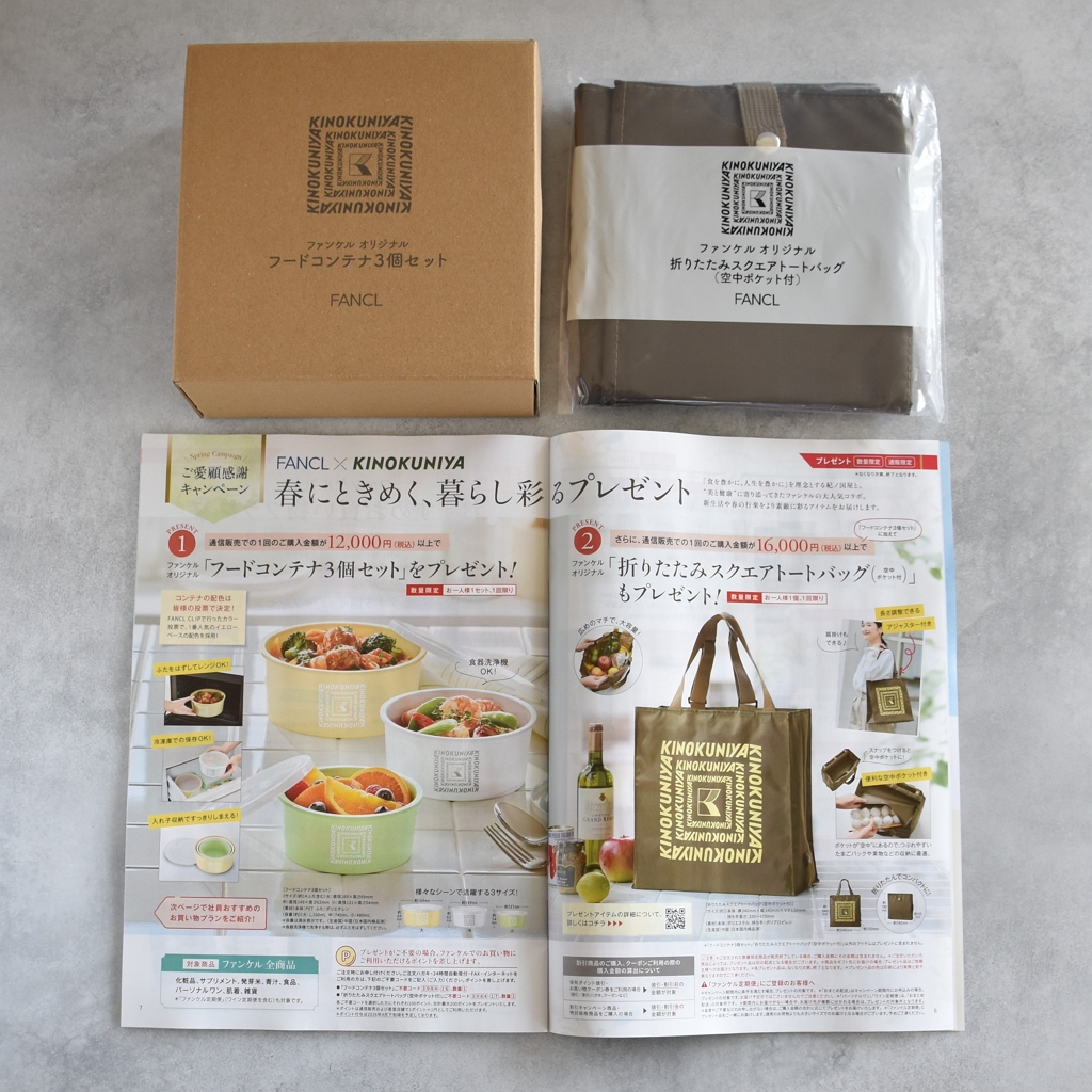 ファンケルの【ご愛顧感謝キャンペーン】のプレゼントが届きました。2026年春はファンケルと紀伊国屋のコラボ。春らしい淡い色味の【フードコンテナ3個セット】と、持ち手の長さを調節できるアジャスタブルストラップの【折りたたみスクエアトートバッグ】。どちらも紀伊国屋のおなじみのロゴ入り。ファンケル通販で購入金額に応じてもらえます。