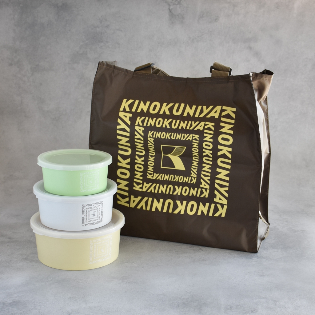 【FANCL×KINOKUNIYA】の【フードコンテナ3個セット】と【折りたたみスクエアトートバッグ】。