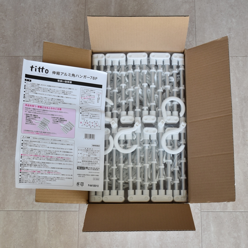 そして、買ってよかったものとして少し紹介しただけで、詳しい紹介ができず仕舞いになっていた【titto 伸縮アルミ角ハンガー78P】。