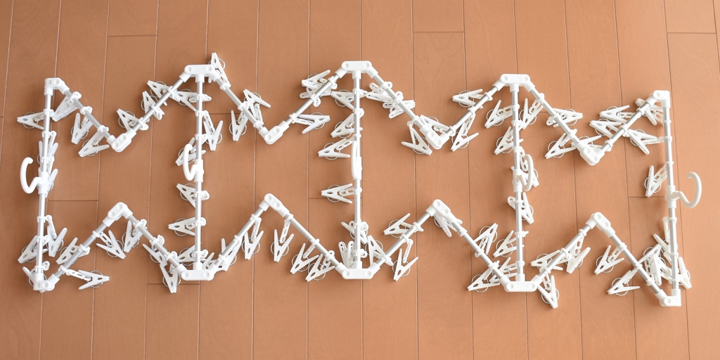 竿の長さに応じてフレームも調整し、ピンチの位置を変えて自分好みにアレンジできる洗濯物干しです。