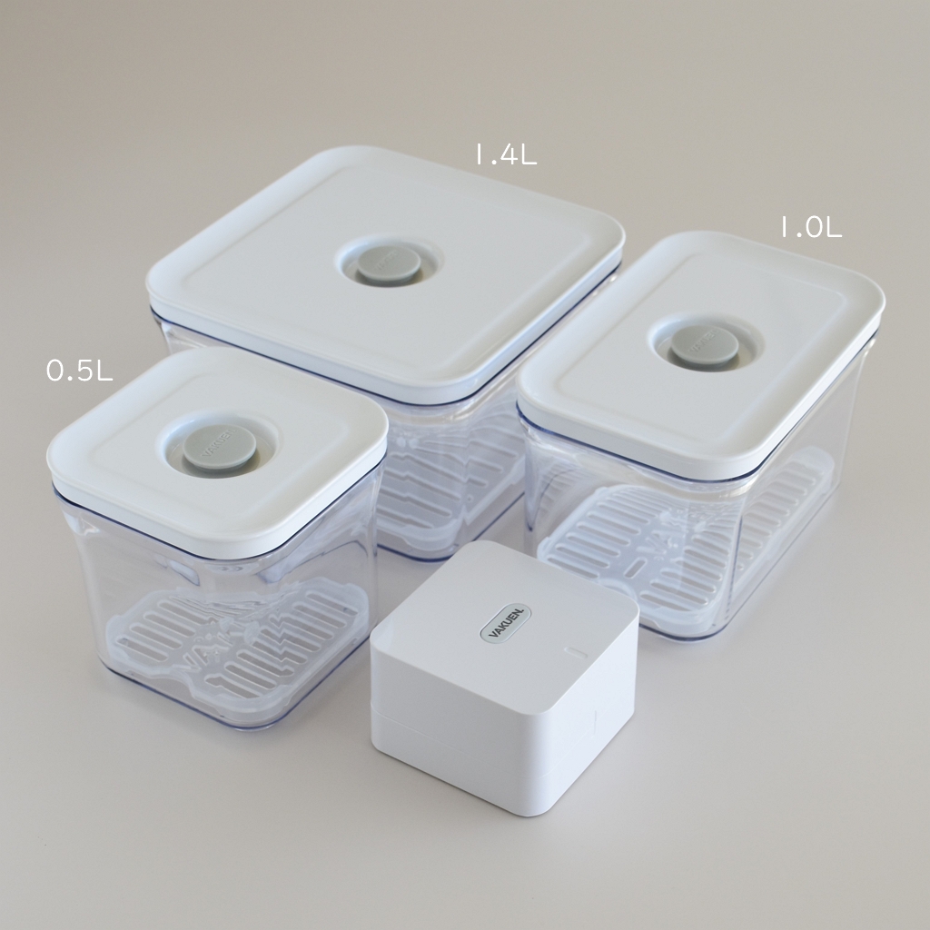 昨年10月にお試しさせていただいた【VAKUEN】は、自動真空ポンプ(1個)と真空保存容器(4サイズ6個)の7点セット。