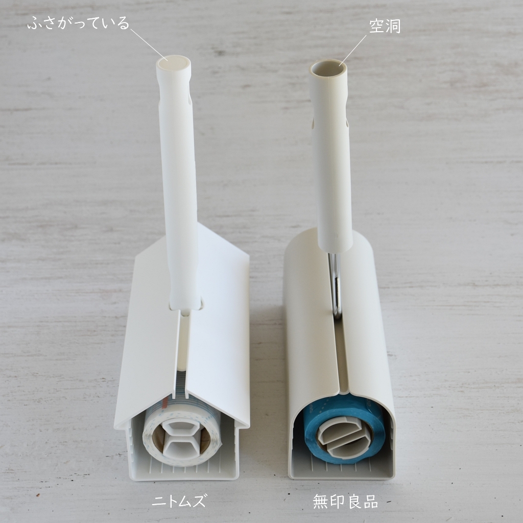 ハンドル上部がふさがっているか空洞かの違いはありますが、ケースの左右どちら側にも収納可能で、ニトムズと無印良品のカーペットクリーナーと使い勝手に大きな違いはありません。
