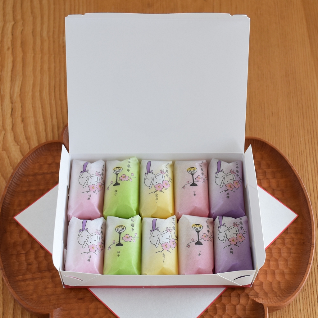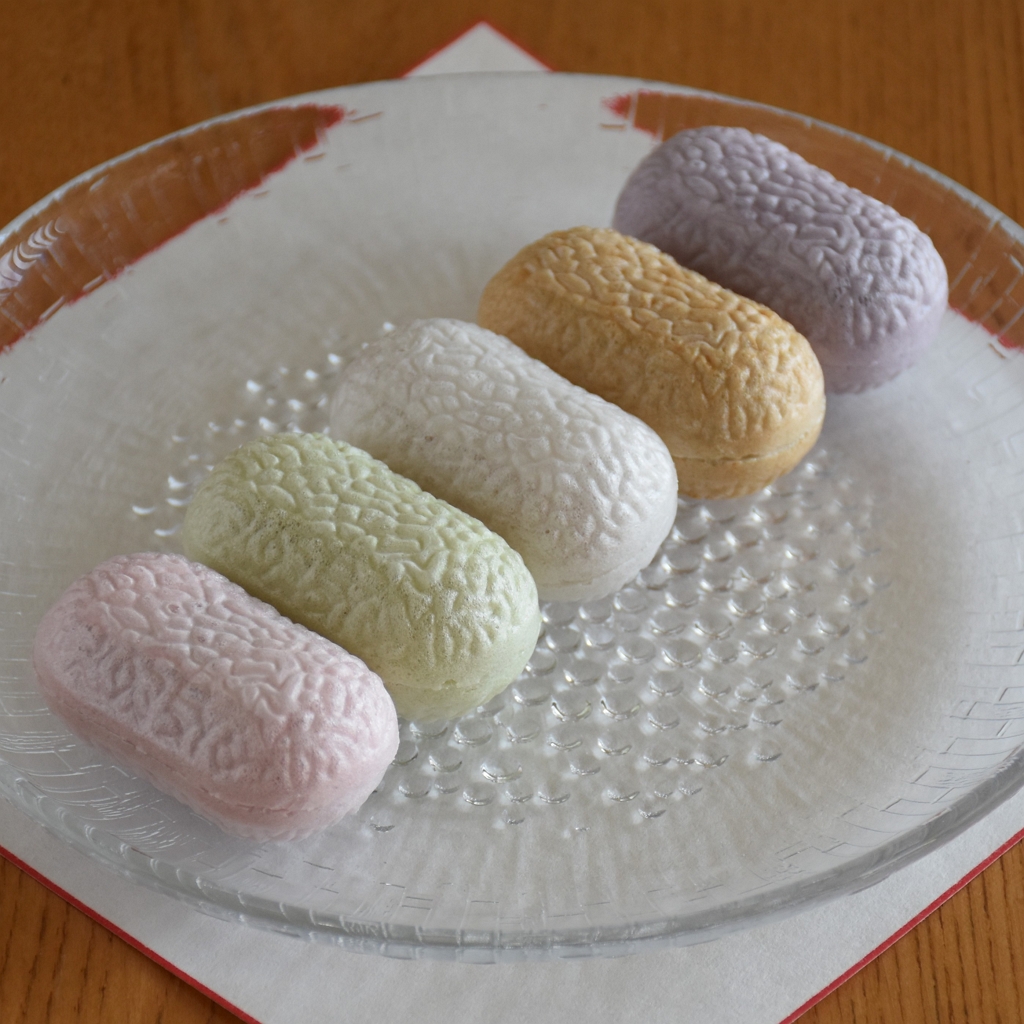 まゆ最中は、まゆを象った5色の最中種(皮)で、5種の餡が包まれてます。