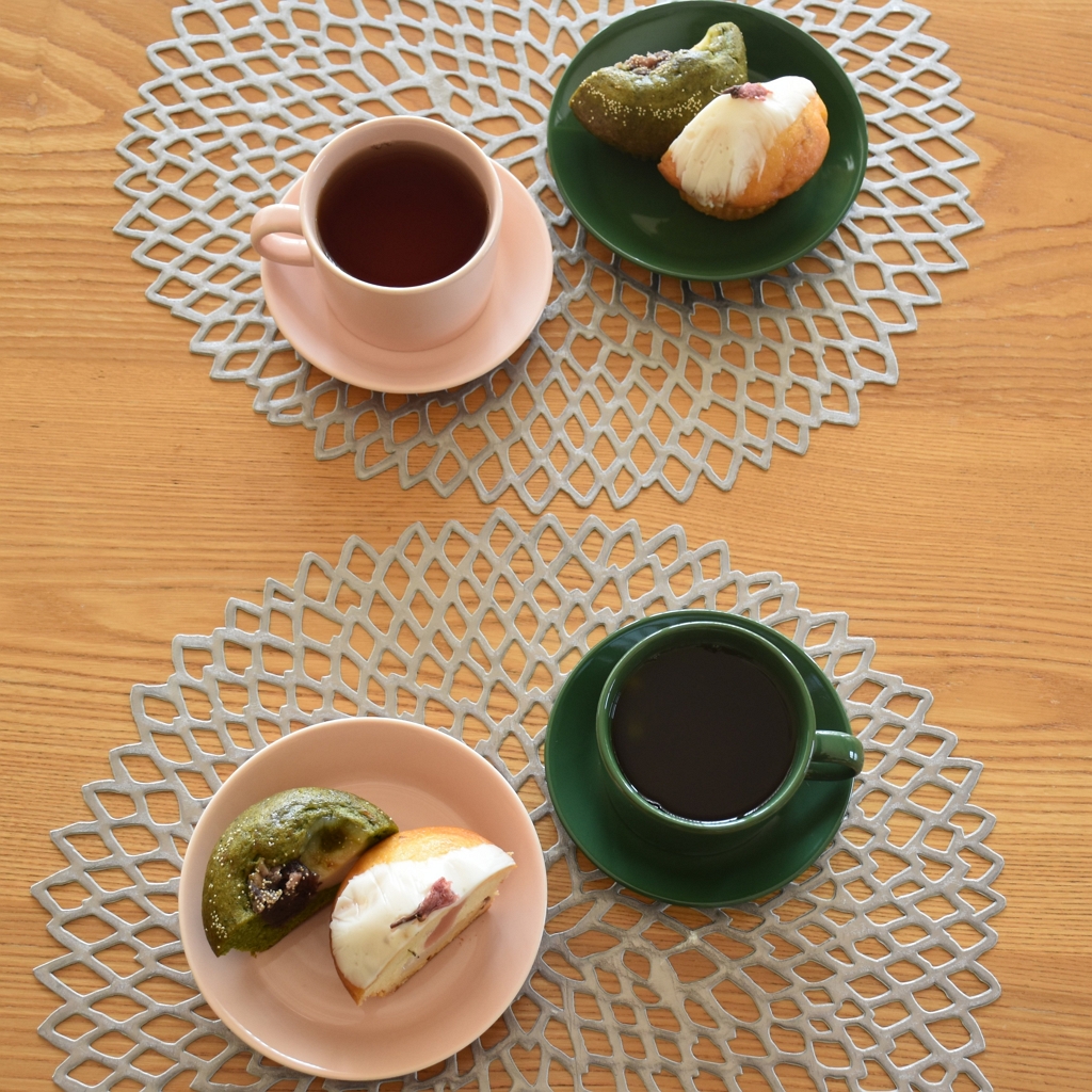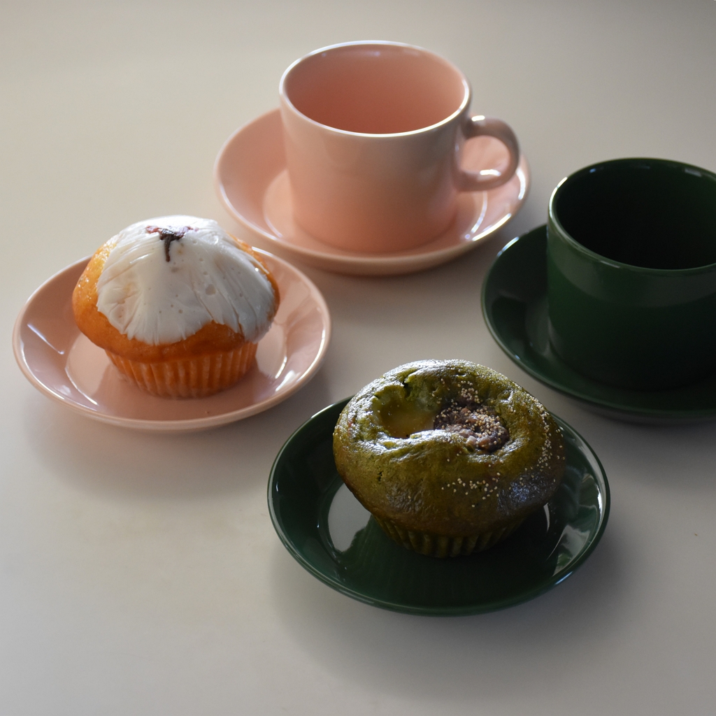 イッタラ ティーマ 2026年春夏シーズナルカラーの緑色の【ハンター】と、桜のようなピンク色が春らしい【パウダー】で春のスイーツを楽しみました。scope特注ティーカップ、プレート12cmと15cmを組み合わせ、春のティータイムコーディネイトの完成です。