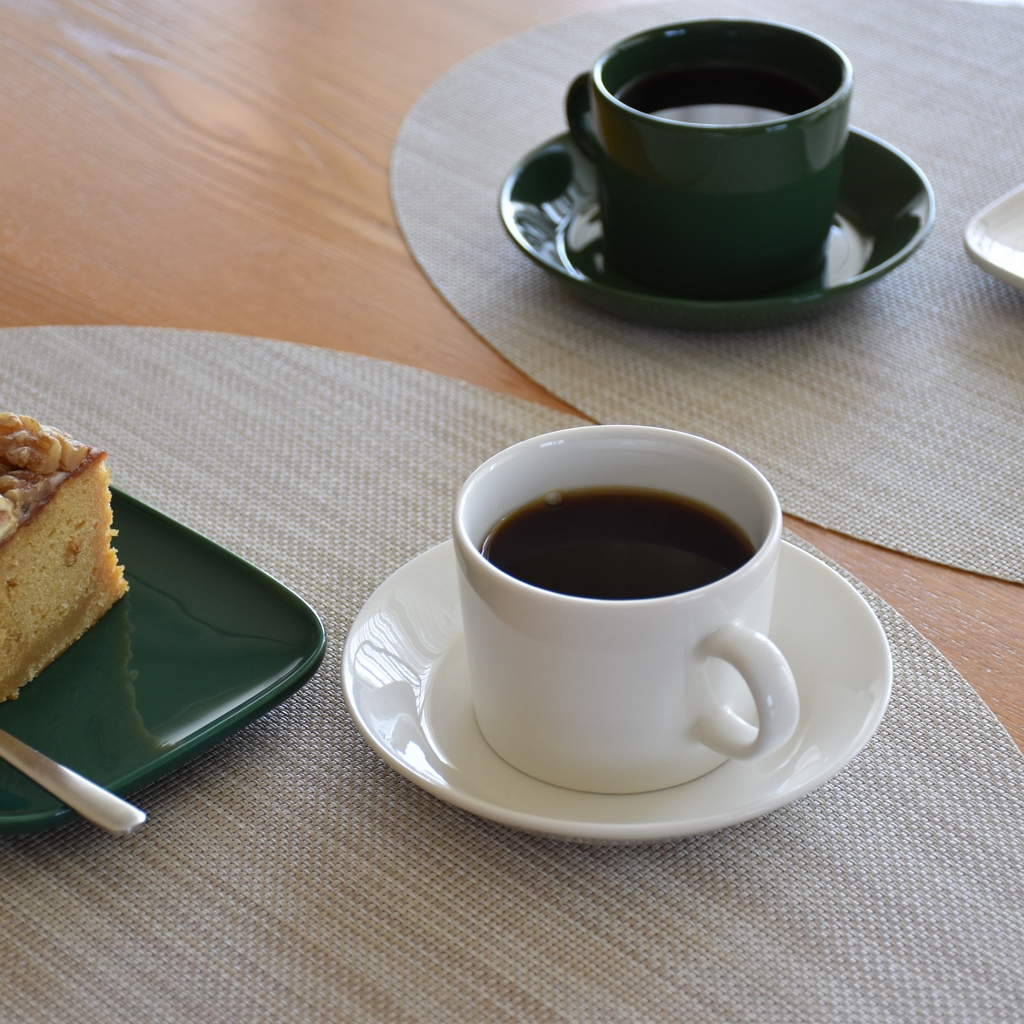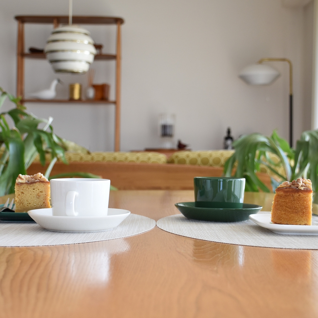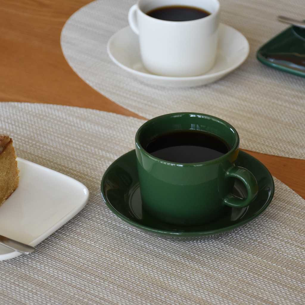 イッタラ ティーマの定番ホワイトと、2026年春夏のシーズナルカラー【ハンター】でコーヒータイム。コーヒーを淹れて、ホワイトデーのケーキを切りました。季節によって、いろんな組み合わせが楽しみなハンターグリーンは、ホワイトとの組み合わせも良かったです。白×緑の爽やかな組み合わせでホワイトデーのケーキを堪能しました。