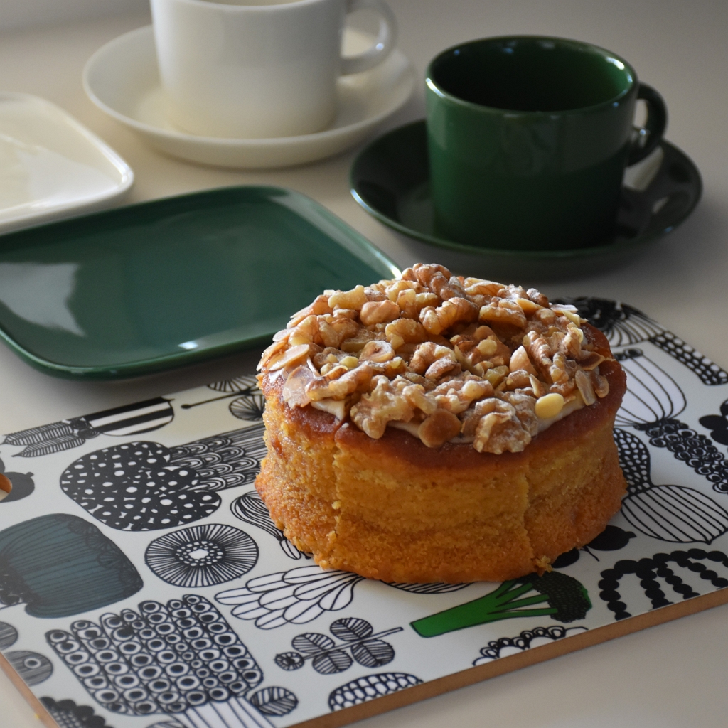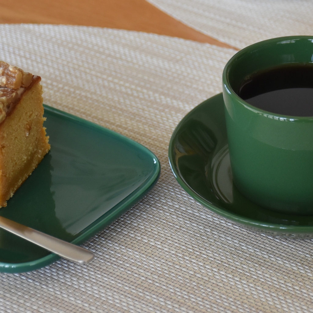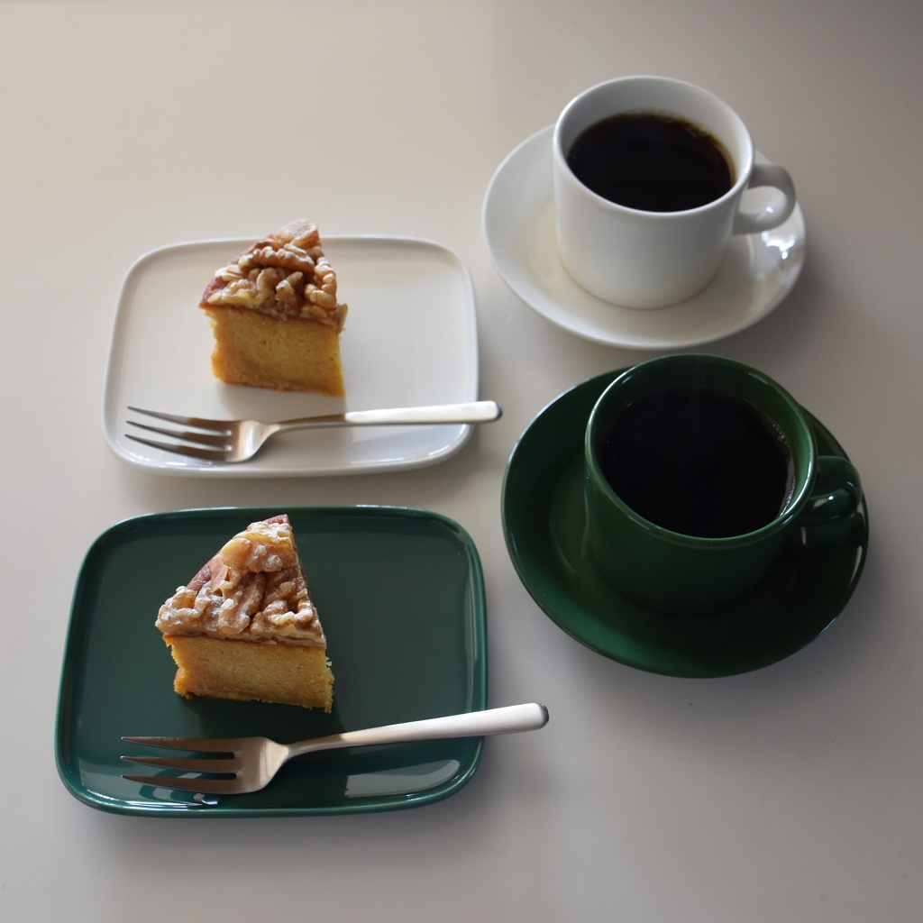イッタラ ティーマの定番ホワイトと、2026年春夏のシーズナルカラー【ハンター】でコーヒータイム。コーヒーを淹れて、ホワイトデーのケーキを切りました。季節によって、いろんな組み合わせが楽しみなハンターグリーンは、ホワイトとの組み合わせも良かったです。白×緑の爽やかな組み合わせでホワイトデーのケーキを堪能しました。