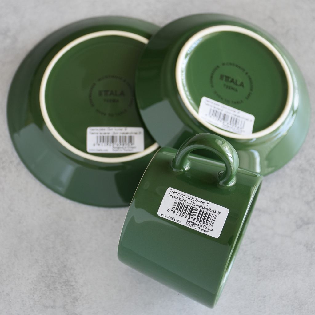 2026年3月2日発売のティーマのシーズナルカラー【ハンター】を買いました。スコープさん特注のティーカップ、プレート12cmと15cm。グリーンのティーカップとソーサーはティーマの前身、アラビアのキルタを連想するのですが、【ハンターグリーン】から連想するのはスナフキンです。