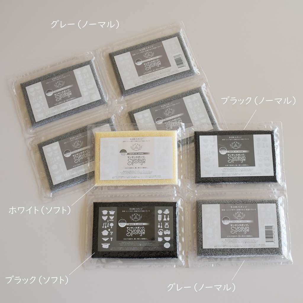 【ホワイト(ソフト)】と【グレー(ノーマル)】はキッチン用、【ブラック(ソフト)】はもんたの食器用、【ブラック(ノーマル)】はお風呂スポンジにしています。